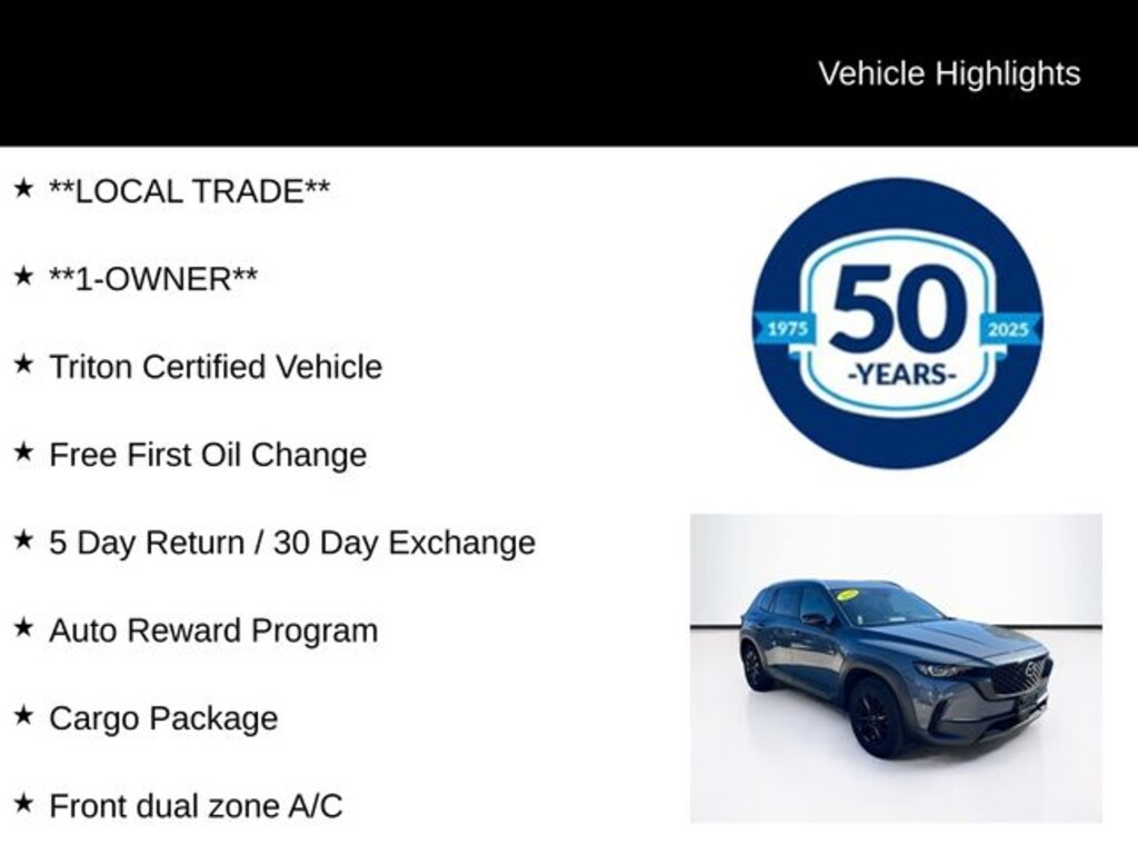 **LOCAL TRADE**, **1-OWNER**, Triton Certified Vehicle, Free First Oil Change, 5 Day Return / 30 Day Exchange, Auto Reward Program, AppLink/Apple CarPlay and Android Auto, Cargo Blocks, Cargo Net, Cargo Package, Exterior Parking Camera Rear, Front dual zone A/C, Power Liftgate, Power moonroof, 12 Speakers, 4-Wheel Disc Brakes, 4.367 Axle Ratio, ABS brakes, Air Conditioning, Alloy wheels, AM/FM radio: SiriusXM, Auto High-beam Headlights, Automatic temperature control, Brake assist, Bumpers: body-color, Carpet Cargo Mat, Delay-off headlights, Driver door bin, Driver vanity mirror, Dual front impact airbags, Dual front side impact airbags, Electronic Stability Control, Emergency communication system: MAZDA CONNECT, Front anti-roll bar, Front Bucket Seats, Front Center Armrest, Front reading lights, Front wheel independent suspension, Fully automatic headlights, Half Leatherette Seat Trim, Heated door mirrors, Heated Front Bucket Seats, Heated front seats, Illuminated entry, Knee airbag, Leather Shift Knob, Leather steering wheel, Low tire pressure warning, Occupant sensing airbag, Outside temperature display, Overhead airbag, Overhead console, Panic alarm, Passenger door bin, Passenger vanity mirror, Polymetal Gray Metallic Paint Charge, Power door mirrors, Power driver seat, Power steering, Power windows, Radio data system, Radio: AM/FM/HD Audio System, Rain sensing wipers, Rear seat center armrest, Rear window defroster, Rear window wiper, Remote keyless entry, Speed control, Speed-sensing steering, Split folding rear seat, Spoiler, Steering wheel mounted audio controls, Tachometer, Telescoping steering wheel, Tilt steering wheel, Traction control, Trip computer, Turn signal indicator mirrors, Variably intermittent wipers, Wheels: 17" x 7J Aluminum Alloy, AppLink/Apple CarPlay and Android Auto, Cargo Blocks, Cargo Net, Cargo Package, Exterior Parking Camera Rear, Front dual zone A/C, Power Liftgate, Power moonroof.