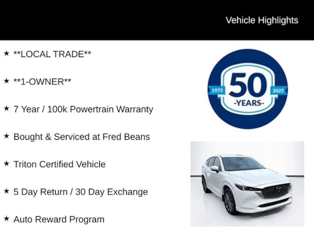 **LOCAL TRADE**, **1-OWNER**, 7 Year / 100k Powertrain Warranty, Bought & Serviced at Fred Beans, Triton Certified Vehicle, 5 Day Return / 30 Day Exchange, Auto Reward Program, 10 Speakers, 4-Wheel Disc Brakes, ABS brakes, Air Conditioning, All-Weather Floor Mats, Alloy wheels, AM/FM radio: SiriusXM, AppLink/Apple CarPlay and Android Auto, Auto High-beam Headlights, Auto-dimming Rear-View mirror, Automatic temperature control, Brake assist, Bumpers: body-color, Cargo Net, Cargo Tray, Delay-off headlights, Driver door bin, Driver vanity mirror, Dual front impact airbags, Dual front side impact airbags, E911 Automatic Emergency Notification, Electronic Stability Control, Emergency communication system: MAZDA CONNECT, First Aid Kit, Four wheel independent suspension, Front & Rear Splash Guards, Front anti-roll bar, Front Bucket Seats, Front Center Armrest w/Storage, Front dual zone A/C, Front reading lights, Fully automatic headlights, Garage door transmitter: HomeLink, Genuine wood dashboard insert, Genuine wood door panel insert, Heads-Up Display, Heated door mirrors, Heated front seats, Heated rear seats, Heated steering wheel, Heated/Ventilated Front Bucket Seats, Illuminated entry, Infotainment System Voice Command, Leather Shift Knob, Leather steering wheel, Low tire pressure warning, Mazda Navigation System, Memory seat, Multifunction Commander Control, Nappa Leather Seat Trim, Navigation system: MAZDA CONNECT, Occupant sensing airbag, Outside temperature display, Overhead airbag, Overhead console, Pandora, Panic alarm, Passenger door bin, Passenger vanity mirror, Power door mirrors, Power driver seat, Power Liftgate, Power moonroof, Power passenger seat, Power steering, Power windows, Radio Broadcast Data System Program Information, Radio data system, Radio: AM/FM/HD Audio System, Rain sensing wipers, Rear anti-roll bar, Rear reading lights, Rear seat center armrest, Rear window defroster, Rear window wiper, Remote keyless entry, Rhodium White Metallic Paint, SMS Text Msg Audio Delivery & Reply, Speed control, Speed-sensing steering, Split folding rear seat, Spoiler, Steering wheel mounted audio controls, Tachometer, Telescoping steering wheel, Tilt steering wheel, Traction control, Trip computer, Turn signal indicator mirrors, Variably intermittent wipers, Ventilated front seats, Wheel Locks, Wheels: 19" x 7J Aluminum Alloy.