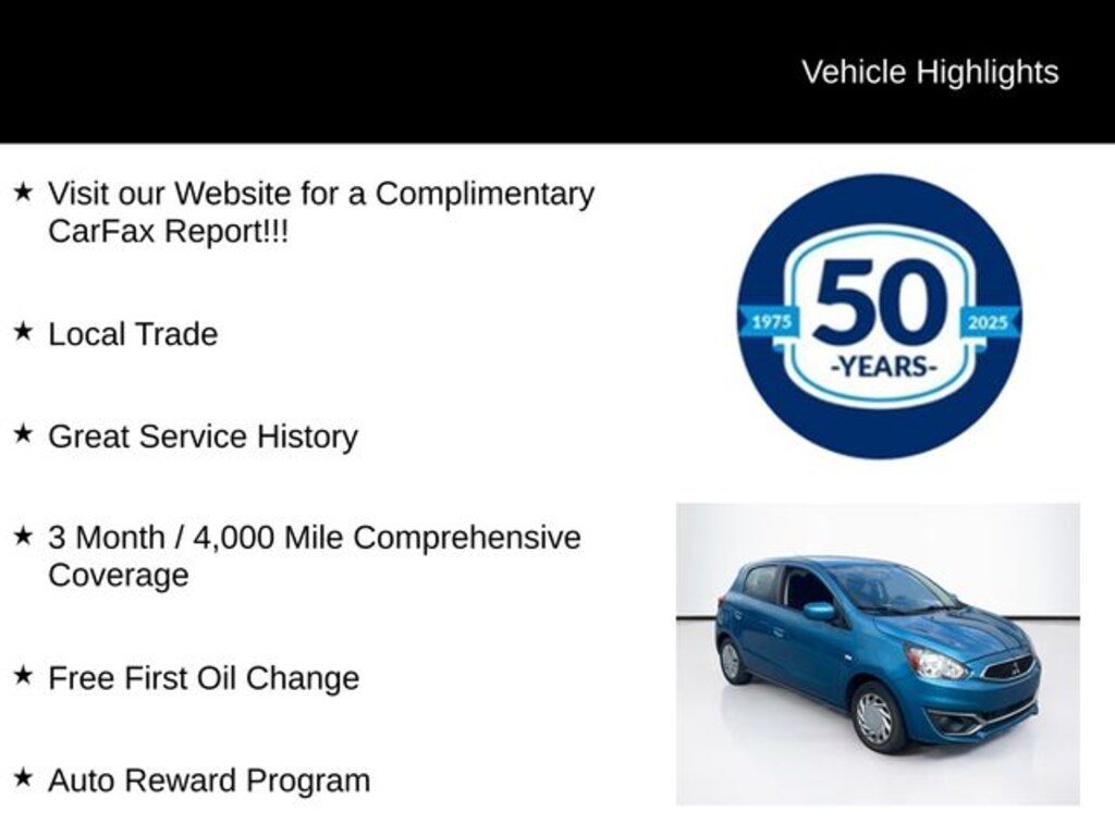 2017 Mitsubishi Mirage ES 1.2L 3-Cylinder DOHC MIVEC 5-Speed Manual FWD 4D Hatchback Sapphire Blue Visit our Website for a Complimentary CarFax Report!!!, Local Trade, Great Service History, 3 Month / 4,000 Mile Comprehensive Coverage, Free First Oil Change, Auto Reward Program, 4 Speakers, ABS brakes, Air Conditioning, AM/FM radio, AM/FM/CD/MP3 Audio System, Brake assist, Bumpers: body-color, CD player, Cloth Fabric Seating Surfaces, Driver door bin, Driver vanity mirror, Dual front impact airbags, Dual front side impact airbags, Electronic Stability Control, Front anti-roll bar, Front Bucket Seats, Front reading lights, Front wheel independent suspension, Illuminated entry, Knee airbag, Low tire pressure warning, Occupant sensing airbag, Overhead airbag, Panic alarm, Passenger door bin, Power door mirrors, Power steering, Power windows, Rear window defroster, Rear window wiper, Remote keyless entry, Split folding rear seat, Spoiler, Tachometer, Tilt steering wheel, Traction control, Trip computer, Variably intermittent wipers, Wheels: 14" Steel w/Wheel Covers.