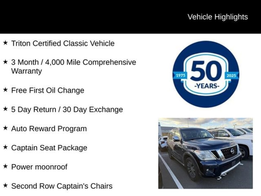 Recent Arrival! 2017 Nissan Armada Platinum 5.6L V8 DOHC 32V Endurance 7-Speed Automatic 4WD 4D Sport Utility Hermosa Blue Triton Certified Classic Vehicle, 3 Month / 4,000 Mile Comprehensive Warranty, Free First Oil Change, 5 Day Return / 30 Day Exchange, Auto Reward Program, 4WD, 3rd row seats: split-bench, Captain Seat Package, Power moonroof, Second Row Captain's Chairs, Second Row Center Console w/ Padded Armrest, Wheels: 20 Machine-Faced Chrome w/Tinted CC.