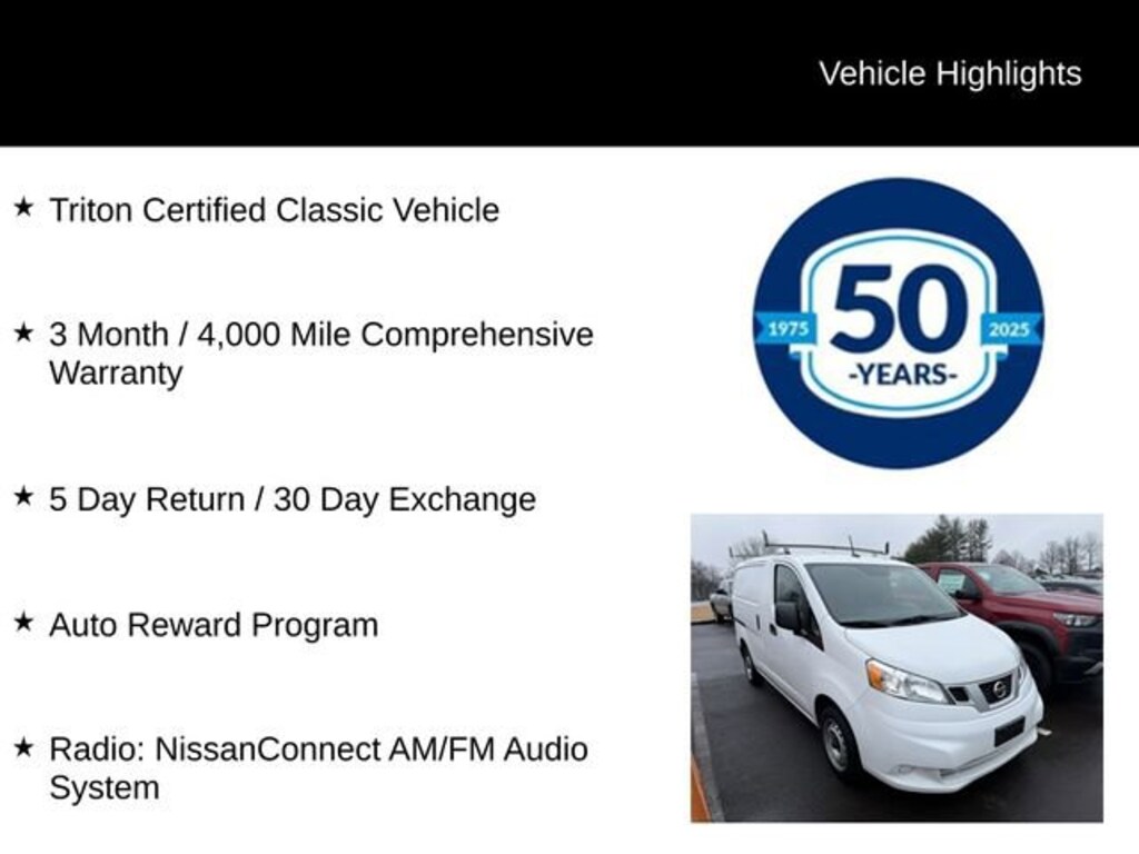 For your peace of mind, this Nissan NV200 is a Triton Certified Classic Vehicle, backed by a comprehensive 3-month/4,000-mile warranty. Additionally, you'll enjoy the confidence of a 5-day return policy and a 30-day exchange option, ensuring your complete satisfaction.