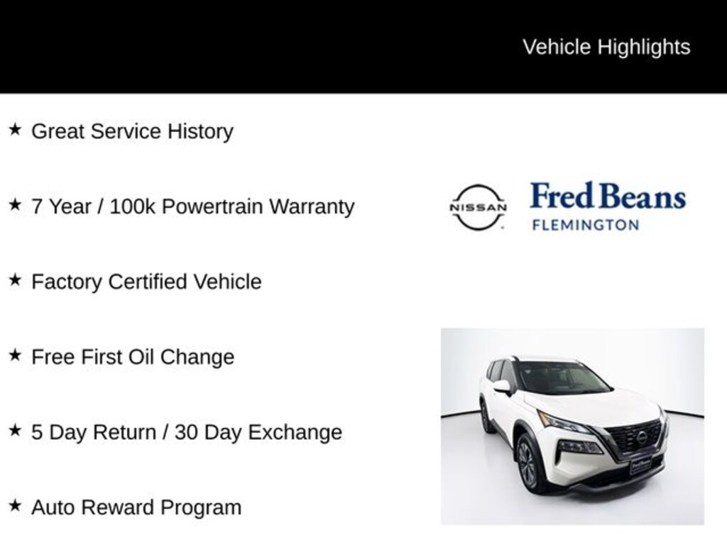 2023 Nissan Rogue SV SV 1.5L I3 Turbocharged DOHC 12V LEV3-ULEV50 201hp CVT with Xtronic AWD 4D Sport Utility Pearl White Tricoat Great Service History, 7 Year / 100k Powertrain Warranty, Factory Certified Vehicle, Free First Oil Change, 5 Day Return / 30 Day Exchange, Auto Reward Program, AWD, 18" Aluminum Alloy Wheels, 4-Wheel Disc Brakes, 5.604 Axle Ratio, 6 Speakers, ABS brakes, Air Conditioning, Alloy wheels, AM/FM Radio, AM/FM radio: SiriusXM, Auto High-beam Headlights, Automatic temperature control, Black Splash Guards (Set of 4), Brake assist, Bumpers: body-color, Chrome Rear Bumper Protector, Cloth Seat Trim, Delay-off headlights, Driver door bin, Driver vanity mirror, Dual front impact airbags, Dual front side impact airbags, Electronic Stability Control, Emergency communication system: NissanConnect Services, First Aid Kit, Floor Mats w/1-Piece Cargo Area Protector, Four wheel independent suspension, Front anti-roll bar, Front Bucket Seats, Front Center Armrest, Front dual zone A/C, Front reading lights, Fully automatic headlights, Heated door mirrors, Illuminated entry, Knee airbag, Low tire pressure warning, NissanConnect featuring Apple CarPlay and Android Auto, Occupant sensing airbag, Outside temperature display, Overhead airbag, Overhead console, Panic alarm, Passenger door bin, Passenger vanity mirror, Power door mirrors, Power driver seat, Power steering, Power windows, Radio data system, Rear anti-roll bar, Rear Parking Sensors, Rear seat center armrest, Rear side impact airbag, Rear window defroster, Rear window wiper, Remote keyless entry, Speed control, Speed-Sensitive Wipers, Split folding rear seat, Spoiler, Steering wheel mounted audio controls, Tachometer, Telescoping steering wheel, Tilt steering wheel, Traction control, Trip computer, Variably intermittent wipers, AWD.