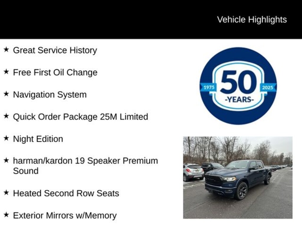 Recent Arrival! 2022 Ram 1500 Limited HEMI 5.7L V8 Multi Displacement VVT 8-Speed Automatic 4WD 4D Crew Cab Patriot Blue Pearlcoat Great Service History, Free First Oil Change, Accent Color Premium Power Mirrors, Apple CarPlay/Android Auto, Auto-Dimming Exterior Driver Mirror, Auto-Dimming Exterior Passenger Mirror, Black Day Light Opening Moldings, Black Exterior Truck Badging, Black Grille Surround Texture 7 Black, Black Headlamp Bezels, Black Painted Exterior Mirrors Caps, Body Color Door Handles, Body Color Front Bumper, Body Color Rear Bumper w/Step Pads, Convex Wide-Angle Mirror Insert, Dual Exhaust w/Black Tips, Exterior Mirrors Courtesy Lamps, Exterior Mirrors w/Heating Element, Exterior Mirrors w/Memory, Exterior Mirrors w/Supplemental Signals, harman/kardon 19 Speaker Premium Sound, Heated Second Row Seats, Navigation System, Night Edition, Power-Folding Mirrors, Quick Order Package 25M Limited, RAM Grille Badge - Black, Sport Performance Hood, Tow Hooks, Tri-Fold Tonneau Cover, Wheels: 22" x 9" Black Aluminum.