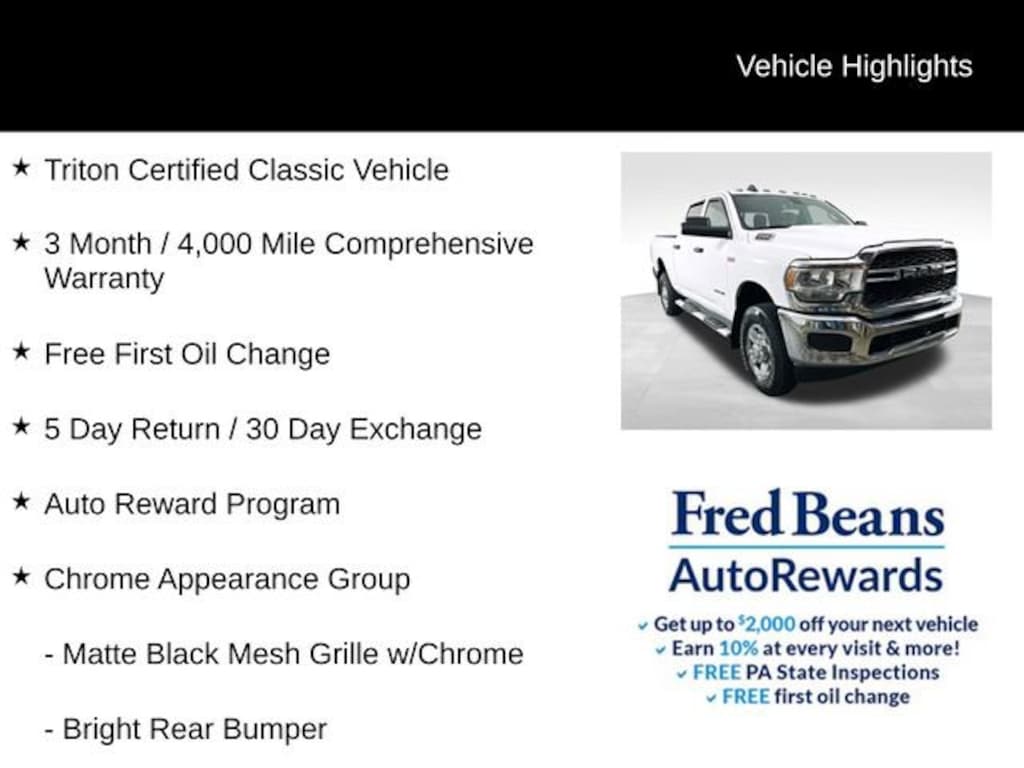 2022 Ram 2500 Tradesman 6.4L V8 8-Speed Automatic 4WD 4D Crew Cab Bright White Clearcoat Triton Certified Classic Vehicle, 3 Month / 4,000 Mile Comprehensive Warranty, Free First Oil Change, 5 Day Return / 30 Day Exchange, Auto Reward Program, Bright Front Bumper, Bright Rear Bumper, Center Hub, Chrome Appearance Group, Chrome Grille Surround, LED Bed Lighting, Matte Black Mesh Grille w/Chrome, MOPAR Spray In Bedliner, Wheels: 18 x 8.0 Steel Chrome Clad.