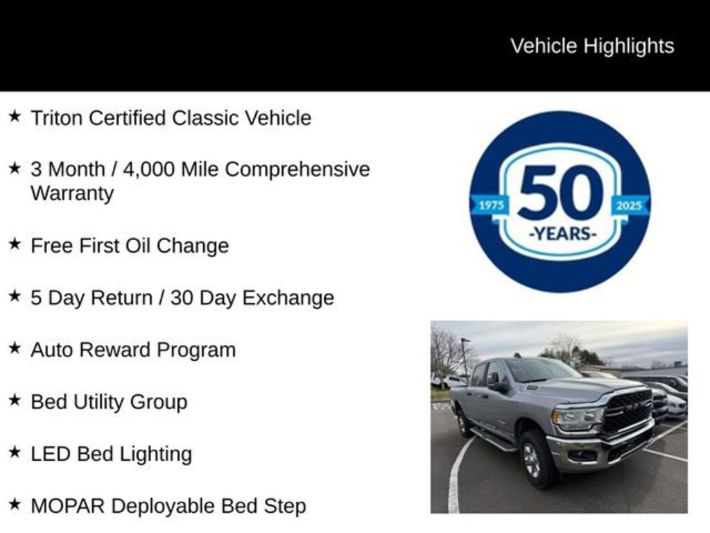 This vehicle is Triton Certified, meaning it has undergone a thorough inspection and comes with a comprehensive warranty, giving you peace of mind and assurance in your purchase. With its impressive features and capabilities, this 2024 Ram 2500 Big Horn is the perfect companion for your next adventure.