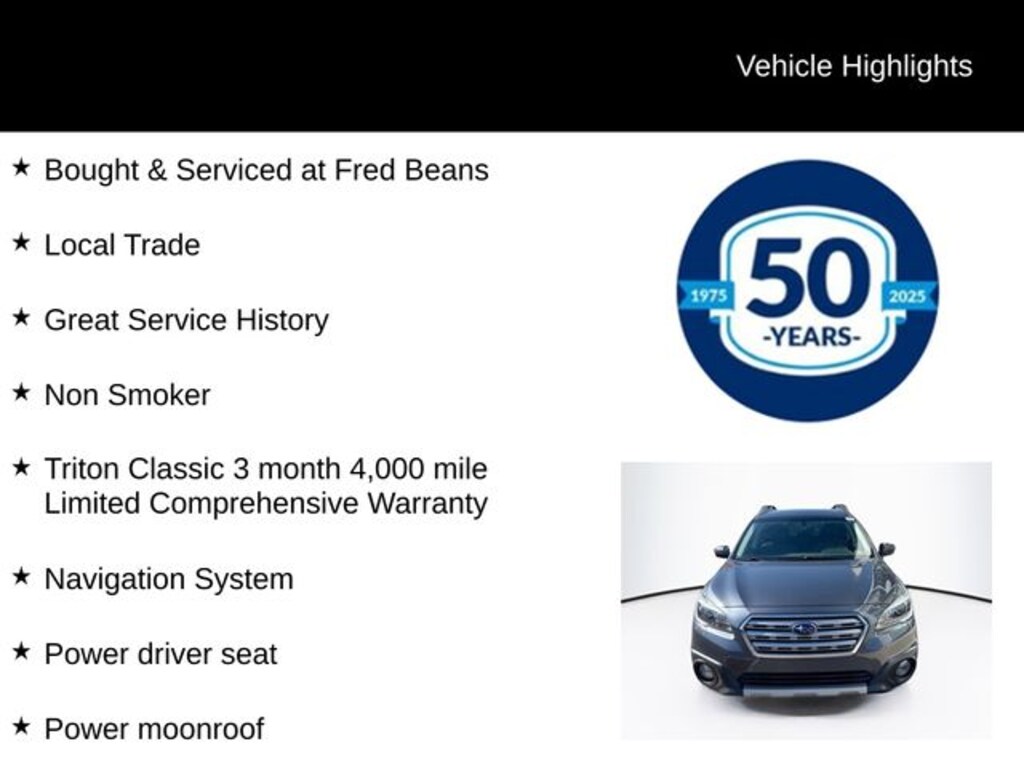 Recent Arrival! 2017 Subaru Outback 2.5i Limited 2.5L 4-Cylinder DOHC 16V CVT Lineartronic AWD 4D Sport Utility Carbide Gray Metallic Bought & Serviced at Fred Beans, Local Trade, Great Service History, Non Smoker, Triton Classic 3 month 4,000 mile Limited Comprehensive Warranty, Exterior Parking Camera Rear, Heated front seats, Heated rear seats, Navigation System, Power driver seat, Power Liftgate, Power moonroof, Reverse Auto Brake.