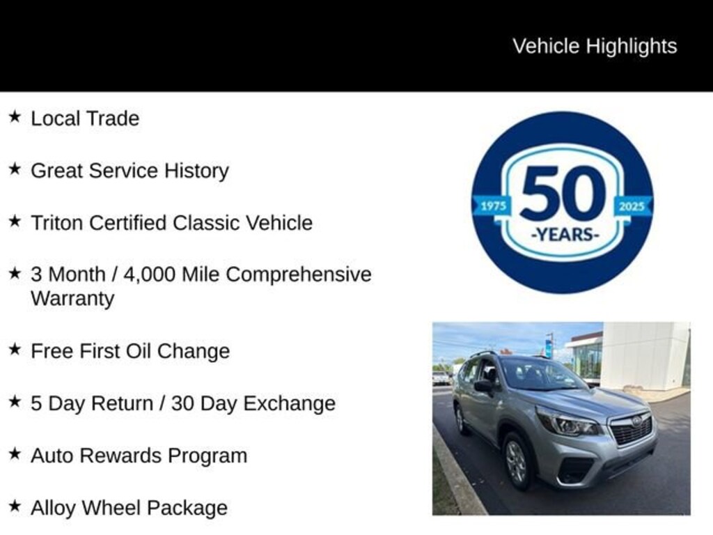 Clean CARFAX. CARFAX One-Owner.Recent Arrival! 2019 Subaru Forester Base 2.5L 4-Cylinder DOHC 16V VVT Lineartronic CVT AWD 4D Sport Utility Ice Silver Metallic Local Trade, Great Service History, Triton Certified Classic Vehicle, 3 Month / 4,000 Mile Comprehensive Warranty, Free First Oil Change, 5 Day Return / 30 Day Exchange, Auto Rewards Program, 4 Speakers, All-Weather Floor Liners, Alloy Wheel Package, Auto-Dimming Exterior Mirror w/Approach Lighting, Auto-Dimming Mirror w/Compass & HomeLink, Automatic temperature control, Black Finish Roof Rails, Cargo Tray, Cloth Upholstery, Exterior Parking Camera Rear, Front Bucket Seats, Fully automatic headlights, Illuminated entry, Popular Package #1, Radio: Subaru Starlink 6.5 Multimedia Plus System, Rear Bumper Cover, STARLINK/Apple CarPlay/Android Auto, Telescoping steering wheel, Tilt steering wheel, Wheels: 17 x 7.0J Silver Finish Aluminum Alloy.Odometer is 26026 miles below market average!Certified. Certification Program Details: Triton Certified Shield Classic 3-Month or 4,000-Mile Comprehensive Coverage ($100 deductible) 100+ Multipoint Inspection PA State Inspection & Emissions Test Oil, Lube, & Filter Service Completed 5-Day Return Policy1 30-Day Exchange Policy2 CARFAXTM Report AutoRewards Membership See salesperson for additional offers & complete details.For better peace of mind all our used vehicles have a 127-point inspection and come with a 5-day return, 30-day exchange (As-Is vehicles are excluded). Our exclusive Auto Rewards Program provides better value with Free First Oil change, Free Pa State Safety inspections, discounts for local merchants and more. Plus, you can earn up to $2000 towards your next vehicle just by servicing with Fred Beans! As Fred Beans always says, our used cars are better because our reputation depends on it.Awards:* 2019 KBB.com 10 Best All-Wheel-Drive Vehicles Under $30,000 * 2019 KBB.com 12 Best Family Cars * 2019 KBB.com 10 Best SUVs Under $30,000 * 2019 KBB.com Brand Image Awards * 2019 KBB.com 5-Year Cost to Own AwardsAlthough every reasonable effort has been made to ensure the accuracy of the information contained on this site, absolute accuracy cannot be guaranteed. This site, and all information and materials appearing on it, are presented to the user as is without warranty of any kind, either express or implied. All vehicles are subject to prior sale. Price does not include applicable tax, title, license, processing and/or documentation fees. Vehicles shown at different locations are not currently in our inventory (Not in Stock) but can be made available to you at our location within a reasonable date from the time of your request, not to exceed one week. Residency restrictions may apply.