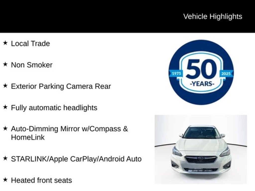 Recent Arrival! 2019 Subaru Impreza 2.0i Premium 2.0L DOHC CVT Lineartronic AWD 4D Sedan Crystal White Pearl Local Trade, Non Smoker, Auto-Dimming Mirror w/Compass & HomeLink, Exterior Parking Camera Rear, Fully automatic headlights, Heated front seats, STARLINK/Apple CarPlay/Android Auto.