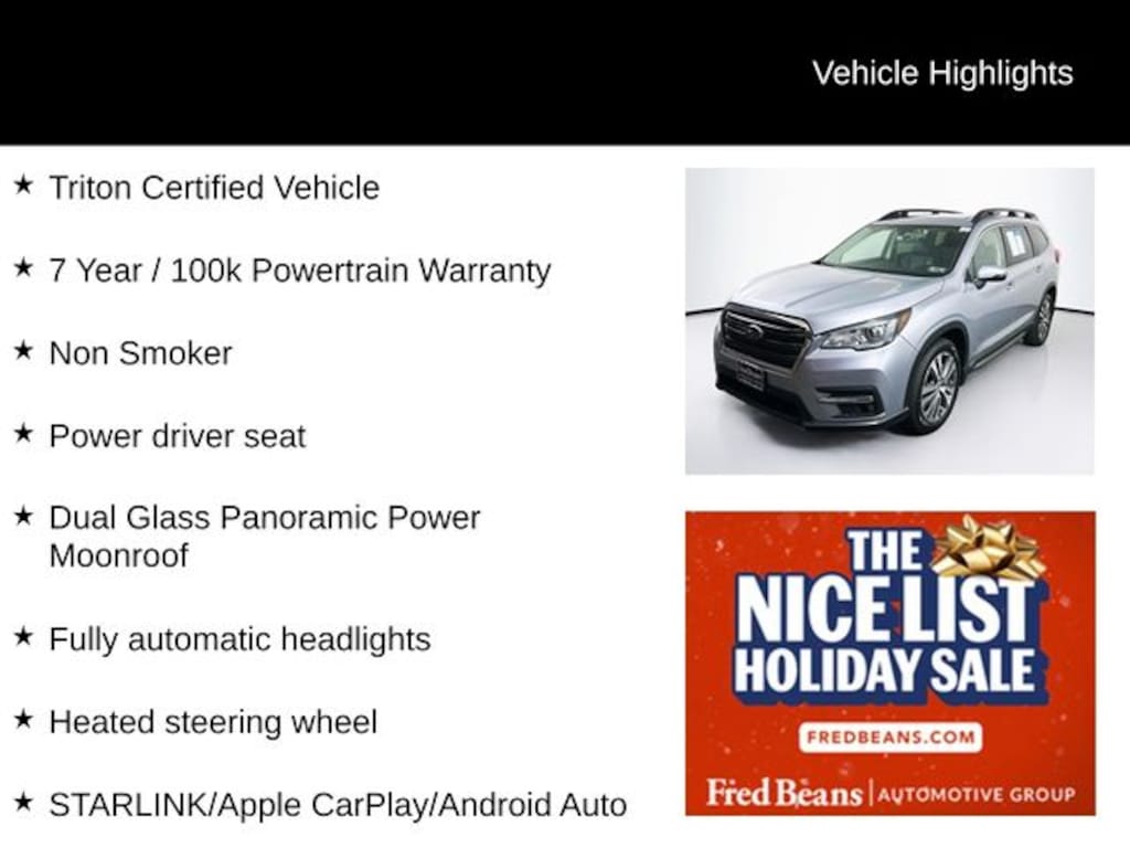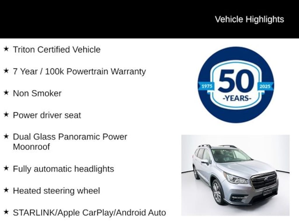 2022 Subaru Ascent Limited 2.4L 4-Cylinder DOHC 16V Lineartronic CVT AWD 4D Sport Utility Ice Silver Metallic Triton Certified Vehicle, 7 Year / 100k Powertrain Warranty, Non Smoker, Dual Glass Panoramic Power Moonroof, Fully automatic headlights, Heated front seats, Heated rear seats, Heated steering wheel, Power driver seat, STARLINK/Apple CarPlay/Android Auto.