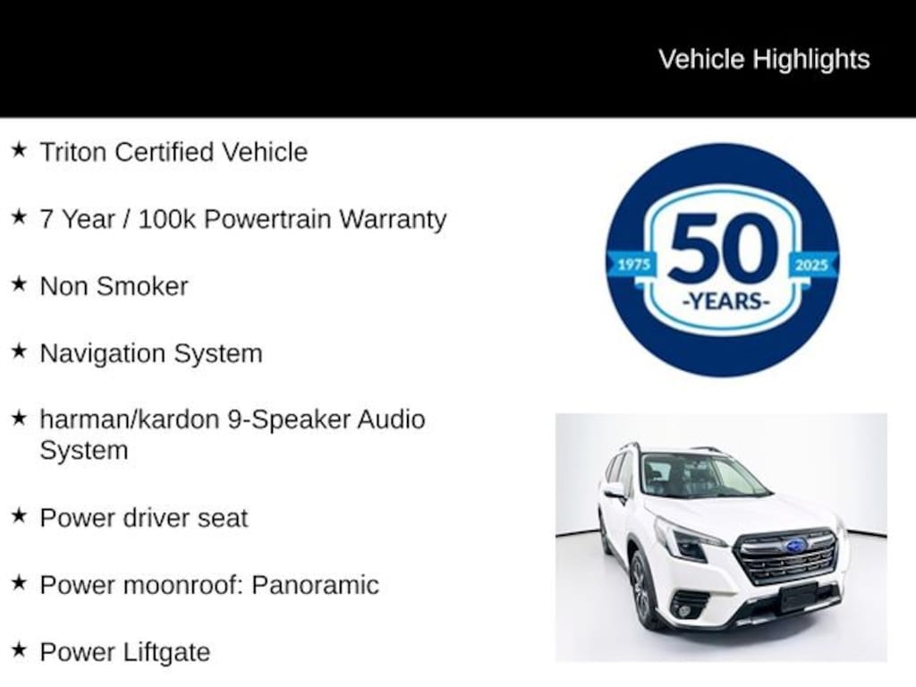 2023 Subaru Forester Limited 2.5L 4-Cylinder DOHC 16V Lineartronic CVT AWD 4D Sport Utility Crystal White Pearl Triton Certified Vehicle, 7 Year / 100k Powertrain Warranty, Non Smoker, Exterior Parking Camera Rear, Fully automatic headlights, harman/kardon 9-Speaker Audio System, Heated front seats, Heated Steering Wheel, Navigation System, Power driver seat, Power Liftgate, Power moonroof: Panoramic, Reverse Automatic Braking System (RAB), STARLINK/Apple CarPlay/Android Auto.