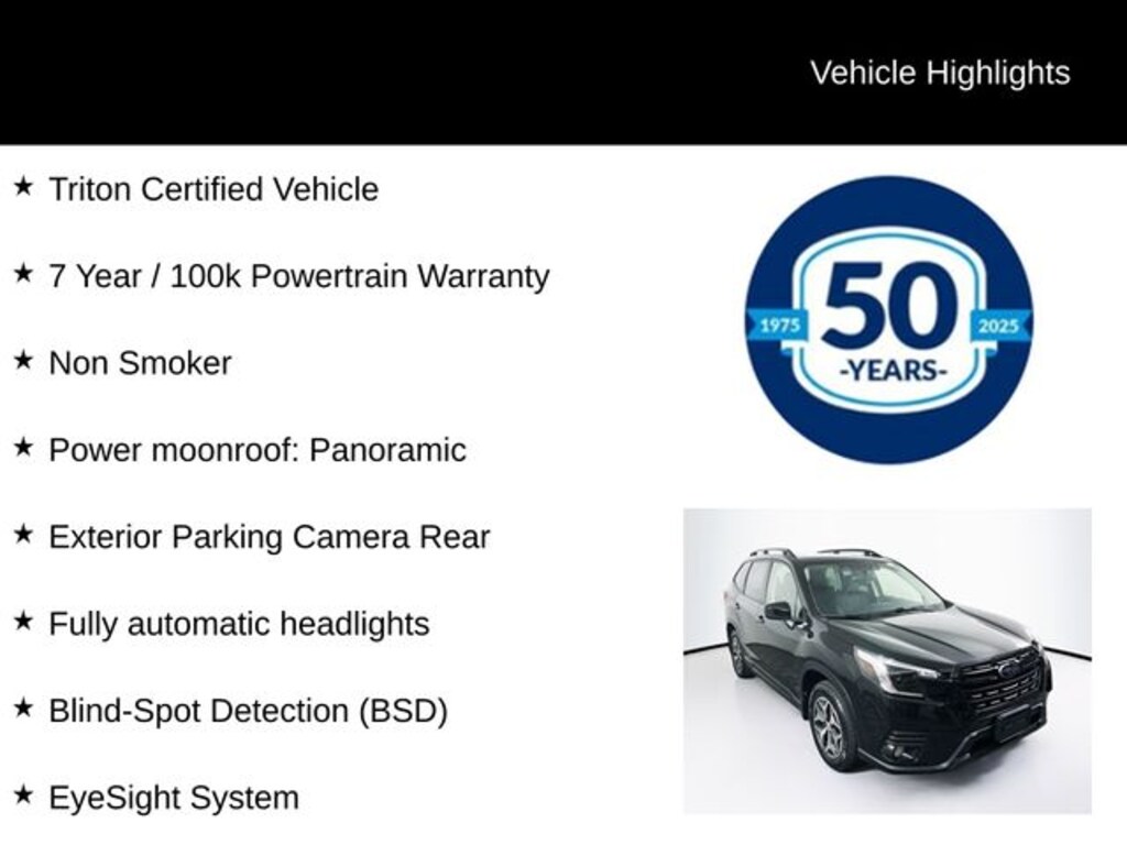 2023 Subaru Forester Premium 2.5L 4-Cylinder DOHC 16V Lineartronic CVT AWD 4D Sport Utility Crystal Black Silica Triton Certified Vehicle, 7 Year / 100k Powertrain Warranty, Non Smoker, Blind-Spot Detection (BSD), Exterior Parking Camera Rear, EyeSight System, Fully automatic headlights, Heated front seats, Power moonroof: Panoramic, STARLINK/Apple CarPlay/Android Auto.