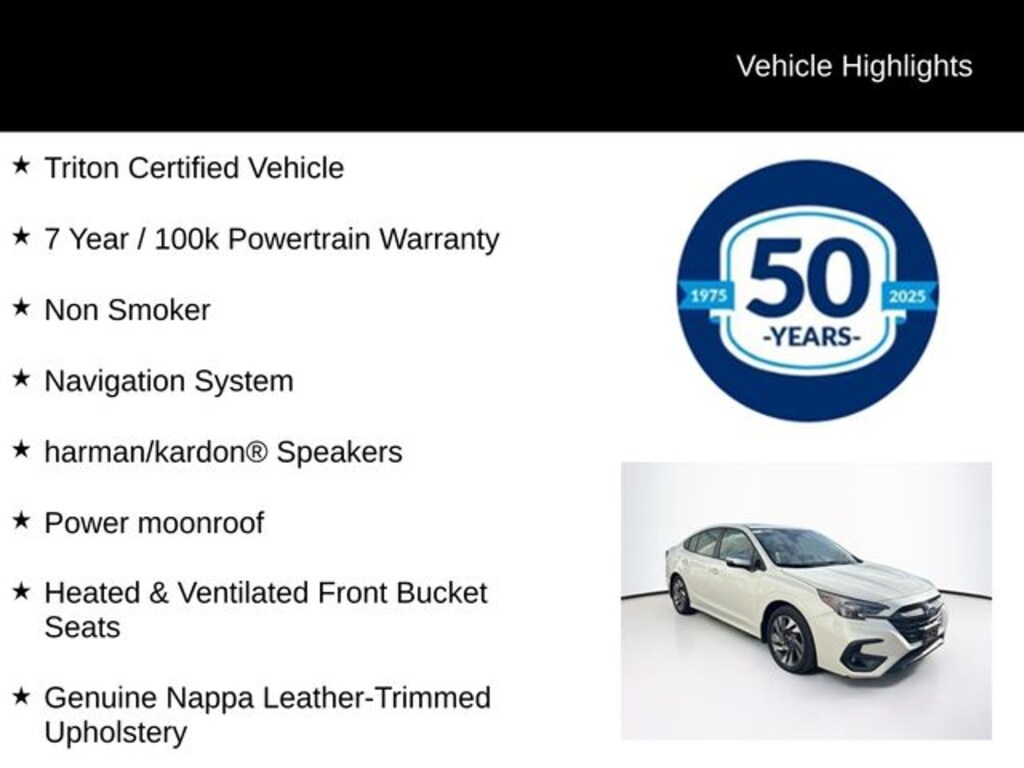 2023 Subaru Legacy Touring XT 2.4L 4-Cylinder DOHC 16V Lineartronic CVT AWD 4D Sedan Crystal White Pearl Triton Certified Vehicle, 7 Year / 100k Powertrain Warranty, Non Smoker, Genuine Nappa Leather-Trimmed Upholstery, harman/kardon® Speakers, Heated & Ventilated Front Bucket Seats, Navigation System, Power moonroof.