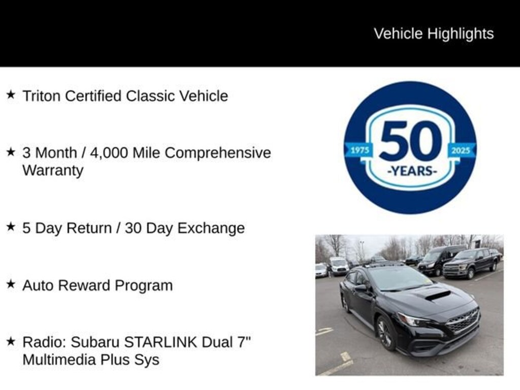 As a Triton Certified Classic Vehicle, this WRX has undergone a rigorous inspection and reconditioning process, ensuring it meets our high standards for quality and reliability. With a comprehensive 3-month/4,000-mile warranty and our 5-day return/30-day exchange policy, you can purchase with confidence, knowing that your satisfaction is our top priority.