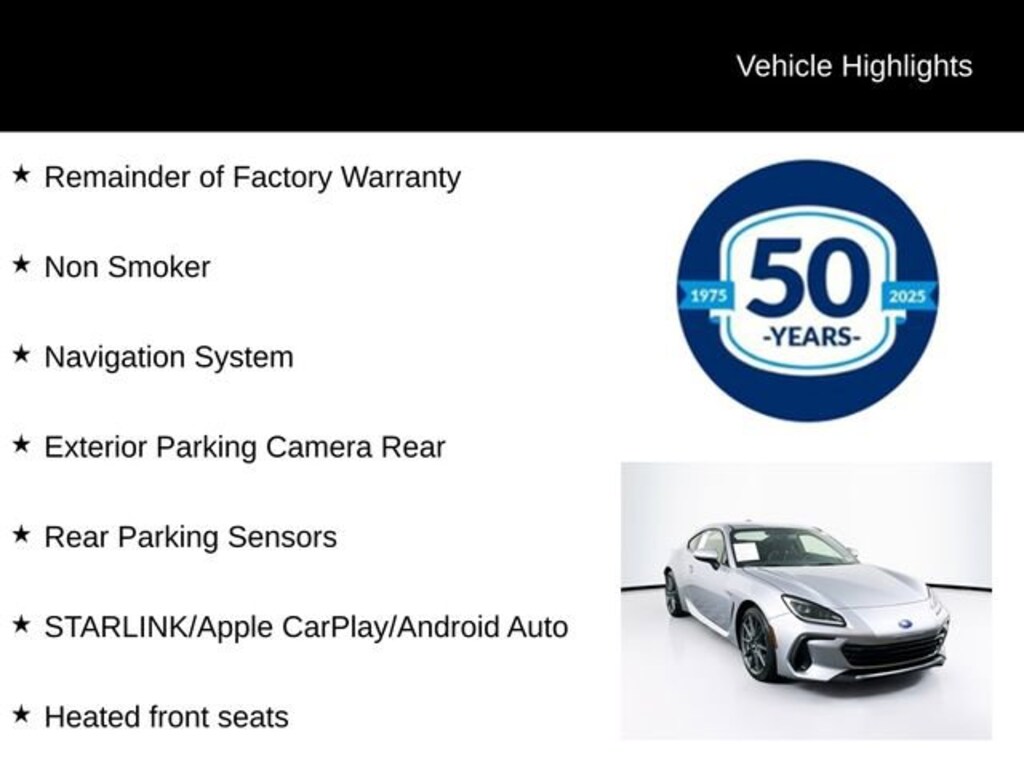 Introducing the 2025 Subaru BRZ Limited, a true driver's delight that combines exhilarating performance with exceptional versatility. This stunning silver coupe is a rare find, with only 468 miles on the odometer and the remainder of the factory warranty still in effect. As a non-smoker's vehicle, you can rest assured that this BRZ has been well-cared for and is ready to provide you with an unforgettable driving experience.