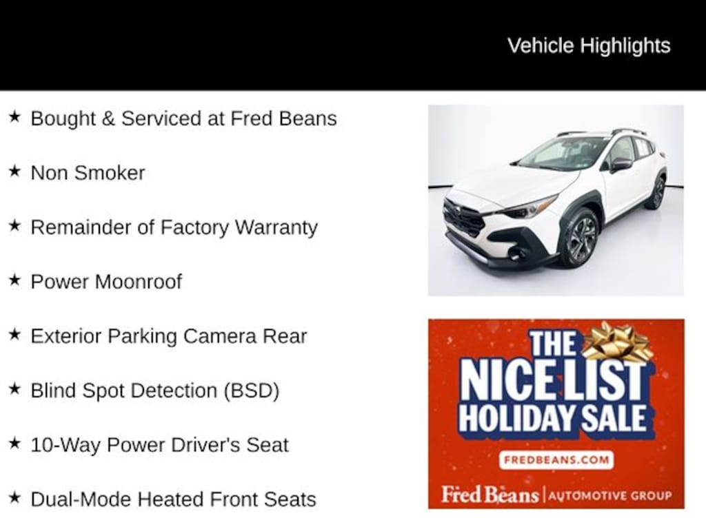 2025 Subaru Crosstrek Premium 2.5L 4-Cylinder DOHC 16V Lineartronic CVT AWD 4D Sport Utility Crystal White Pearl Bought & Serviced at Fred Beans, Non Smoker, Remainder of Factory Warranty, 10-Way Power Driver's Seat, Blind Spot Detection (BSD), Dual-Mode Heated Front Seats, Exterior Parking Camera Rear, Power Moonroof.