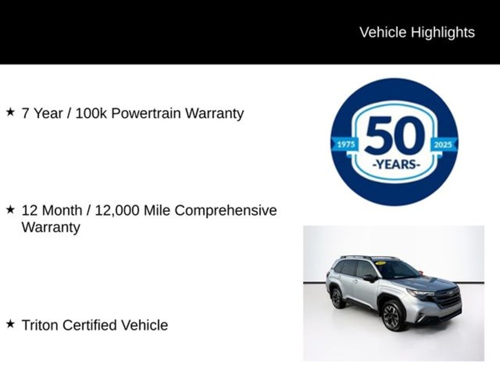 Recent Arrival! 2025 Subaru Forester Premium 2.5L 4-Cylinder DOHC 16V Lineartronic CVT AWD 4D Sport Utility Ice Silver Metallic 7 Year / 100k Powertrain Warranty, 12 Month / 12,000 Mile Comprehensive Warranty, Triton Certified Vehicle. 26/33 City/Highway MPG