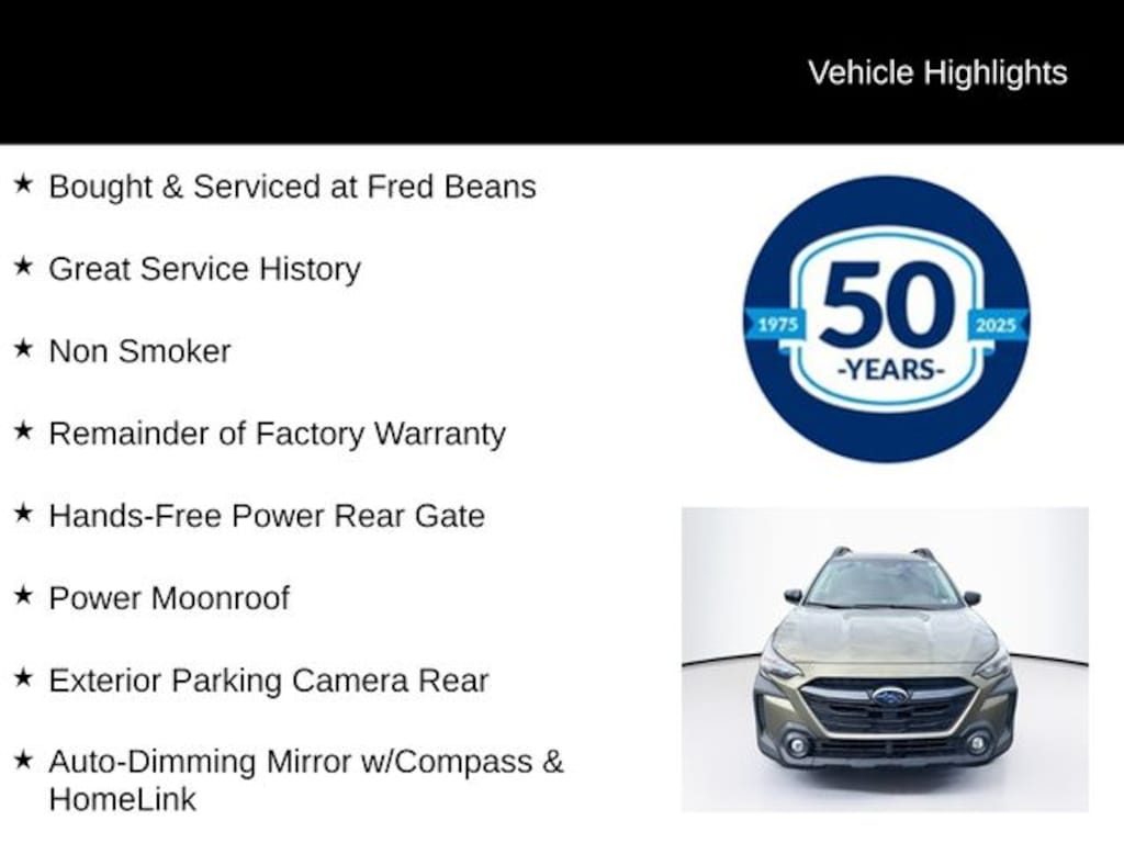 Recent Arrival! 2025 Subaru Outback Premium 2.5L 4-Cylinder DOHC 16V CVT Lineartronic AWD 4D Sport Utility Autumn Green Metallic Bought & Serviced at Fred Beans, Great Service History, Non Smoker, Remainder of Factory Warranty, Apple CarPlay & Android Auto, Auto-Dimming Mirror w/Compass & HomeLink, Blind Spot Detection (BSD), Exterior Parking Camera Rear, Hands-Free Power Rear Gate, Heated front seats, Power Moonroof, Rear Cross Traffic Alert (RCTA).
