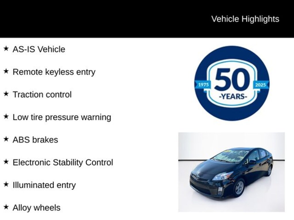 2011 Toyota Prius One 1.8L 4-Cylinder DOHC 16V VVT-i CVT FWD 5D Hatchback Black AS-IS Vehicle, ABS brakes, Alloy wheels, Electronic Stability Control, Illuminated entry, Low tire pressure warning, Remote keyless entry, Traction control. 51/48 City/Highway MPG