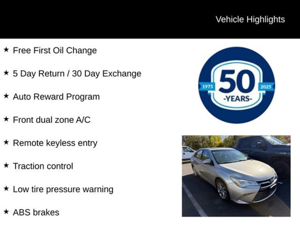 Recent Arrival! 2015 Toyota Camry XLE 3.5L V6 SMPI DOHC 6-Speed Automatic FWD 4D Sedan Creme Brulee Mica Free First Oil Change, 5 Day Return / 30 Day Exchange, Auto Reward Program, Almond Leather, ABS brakes, Alloy wheels, Compass, Electronic Stability Control, Exterior Parking Camera Rear, Front dual zone A/C, Heated door mirrors, Heated front seats, Illuminated entry, Leather Seat Trim, Low tire pressure warning, Power moonroof, Remote keyless entry, Traction control.
