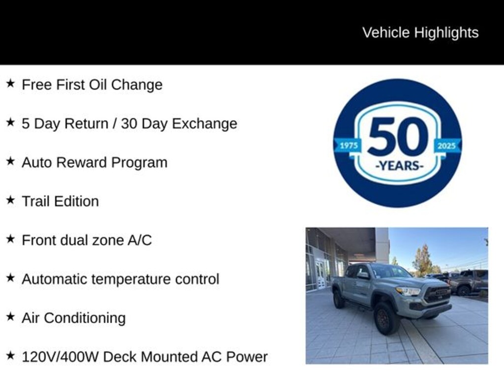 Recent Arrival! 2023 Toyota Tacoma Trail Edition V6 3.5L V6 6-Speed Automatic 4WD 4D Double Cab Lunar Rock Free First Oil Change, 5 Day Return / 30 Day Exchange, Auto Reward Program, Tacoma Trail Edition V6, 4D Double Cab, 3.5L V6, 6-Speed Automatic, 4WD, Lunar Rock, Cement w/Fabric Seat Trim, 120V/400W Deck Mounted AC Power, ABS brakes, Active Cruise Control, Air Conditioning, Alloy wheels, Automatic temperature control, Black Headlamp Bezel, Body Color Overfenders, Electronic Stability Control, Front Door Smart Key System w/Push Button Start, Front dual zone A/C, Heated door mirrors, Heritage Grille, Illuminated entry, Leaf Trail Rear Suspension, Low tire pressure warning, Power Sliding Rear Window w/Privacy Glass, Remote keyless entry, Traction control, Trail Edition.