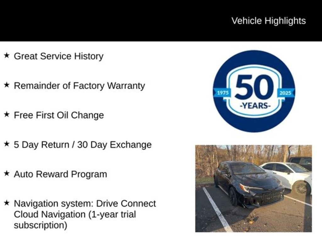 Recent Arrival! 2025 Toyota GR Corolla Premium 1.6L I3 PDI Turbocharged DOHC 12V LEV3-ULEV70 300hp 6-Speed Manual AWD 5D Hatchback Black Great Service History, Remainder of Factory Warranty, Free First Oil Change, 5 Day Return / 30 Day Exchange, Auto Reward Program, Navigation system: Drive Connect Cloud Navigation (1-year trial subscription).