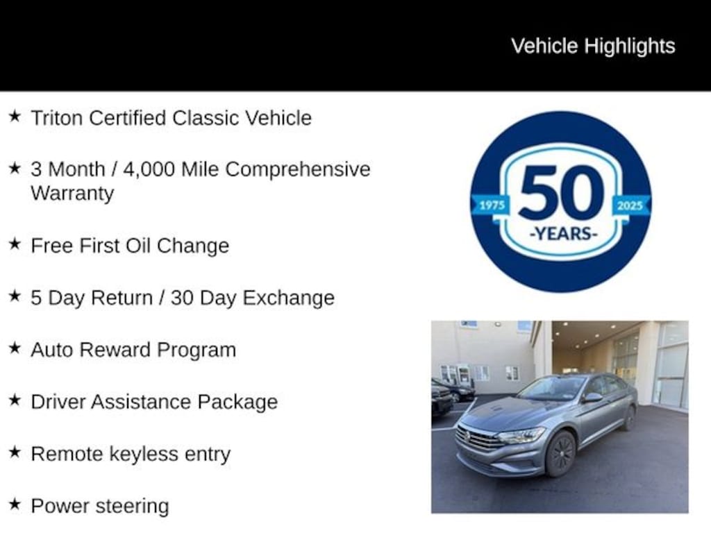 Recent Arrival! 2019 Volkswagen Jetta 1.4T S 1.4L TSI 8-Speed Automatic with Tiptronic FWD 4D Sedan Platinum Gray Metallic Triton Certified Classic Vehicle, 3 Month / 4,000 Mile Comprehensive Warranty, Free First Oil Change, 5 Day Return / 30 Day Exchange, Auto Reward Program, Black Cloth, ABS brakes, Blind Spot Monitor w/Rear Traffic Alert, Driver Assistance Package, Forward Collision Warning, Heated Side Mirrors, Heavy Duty Trunk Liner w/VW CarGo Blocks, Power steering, Power windows, Remote keyless entry, Steering wheel mounted audio controls, Variably intermittent wipers.