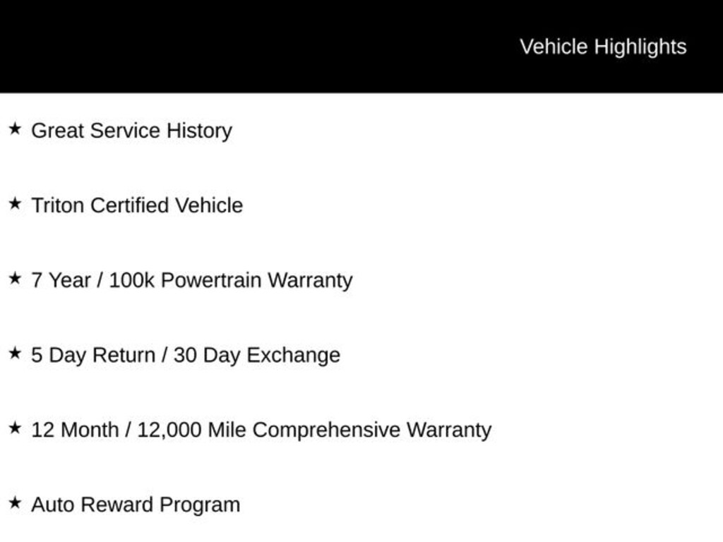Certified. Certification Program Details: Triton Certified Shield • 7-Year or up to 100,000-Mile Powertrain Limited Warranty • 12-Month or 12,000-Mile Comprehensive Coverage ($100 deductible) • 100+ Multipoint Inspection • All Fluids Checked • Tires 6/32" or Better • 50% or Better brakes • Oil, Lube, & Filter Service Completed • PA State Inspection & Emissions Test • 5-Day Return Policy1 • 30-Day Exchange Policy2 • CARFAXTM Report • AutoRewards Membership • See salesperson for additional offers & complete details.
