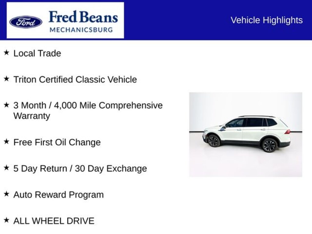 2022 Volkswagen Tiguan 2.0T S 2.0L TSI DOHC 8-Speed Automatic with Tiptronic AWD 4D Sport Utility Pure White Local Trade, Triton Certified Classic Vehicle, 3 Month / 4,000 Mile Comprehensive Warranty, Free First Oil Change, 5 Day Return / 30 Day Exchange, Auto Reward Program, AWD, 3.33 Axle Ratio, 4-Wheel Disc Brakes, 4-Wheel Independent Suspension, 6 Speakers, ABS brakes, Air Conditioning, Alloy wheels, AM/FM radio, Brake assist, Bumpers: body-color, Cloth Seating Surfaces, Compass, Delay-off headlights, Driver door bin, Driver vanity mirror, Dual front impact airbags, Dual front side impact airbags, Electronic Stability Control, Emergency communication system: Car-Net, Exterior Parking Camera Rear, Forward collision: FCW w/Autonomous Emergency Braking mitigation, Four wheel independent suspension, Front anti-roll bar, Front Bucket Seats, Front Center Armrest, Front reading lights, Fully automatic headlights, Heated door mirrors, Heated Front Bucket Seats, Heated front seats, Illuminated entry, Leather Shift Knob, Low tire pressure warning, Occupant sensing airbag, Outside temperature display, Overhead airbag, Overhead console, Panic alarm, Passenger door bin, Passenger vanity mirror, Power door mirrors, Power steering, Power windows, Radio data system, Radio: Composition Color AM/FM, Rear anti-roll bar, Rear reading lights, Rear seat center armrest, Rear window defroster, Rear window wiper, Remote keyless entry, Roof rack: rails only, Speed control, Speed-sensing steering, Split folding rear seat, Spoiler, Steering wheel mounted audio controls, Tachometer, Telescoping steering wheel, Tilt steering wheel, Traction control, Trip computer, Turn signal indicator mirrors, Variably intermittent wipers, Wheels: 17" 2-Tone Machined Twin 5-Spoke Alloy, ALL WHEEL DRIVE, AWD.
