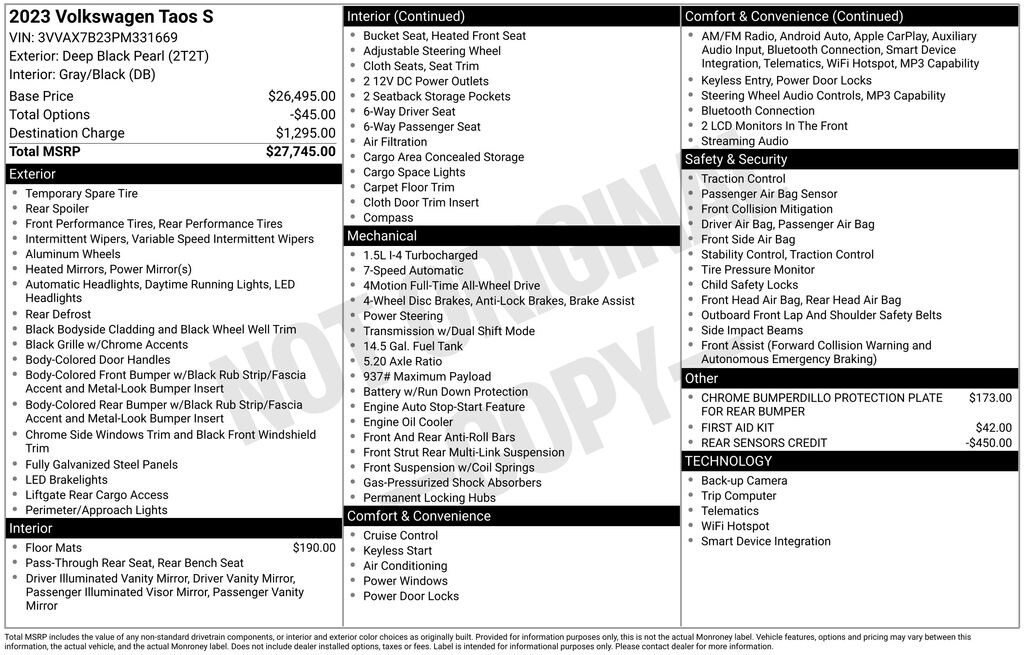 Recent Arrival! 2023 Volkswagen Taos 1.5T S 1.5L I4 Turbocharged DOHC 16V LEV3-SULEV30 158hp 7-Speed DSG Automatic with Tiptronic AWD 4D Sport Utility Deep Black Pearl Great Service History, Remainder of Factory Warranty, Factory Certified Vehicle, Auto Reward Program.