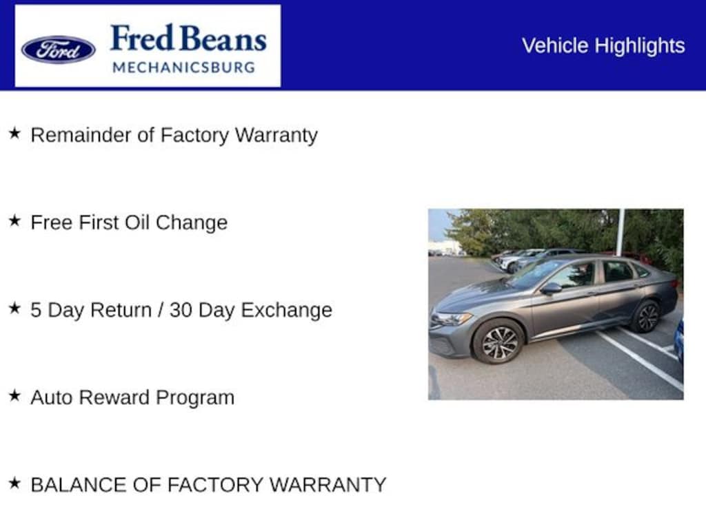 2024 Volkswagen Jetta 1.5T S 1.5L I-4 DI DOHC Turbocharged 8-Speed Automatic with Tiptronic FWD 4D Sedan Gray Remainder of Factory Warranty, Free First Oil Change, 5 Day Return / 30 Day Exchange, Auto Reward Program, Titan Black Cloth, 4 Speakers, 4-Wheel Disc Brakes, ABS brakes, Active Blind Spot Monitor, Air Conditioning, Alloy wheels, Auto-dimming Rear-View mirror, Brake assist, Bumpers: body-color, Cloth Seat Trim, Delay-off headlights, Driver door bin, Driver vanity mirror, Dual front impact airbags, Dual front side impact airbags, Electronic Stability Control, Emergency communication system: VW Car-Net Safe & Secure 5-year, Exterior Parking Camera Rear, Front anti-roll bar, Front Bucket Seats, Front Center Armrest, Front Seats, Front wheel independent suspension, Fully automatic headlights, Heated door mirrors, Illuminated entry, Leather Shift Knob, Leather steering wheel, Low tire pressure warning, Occupant sensing airbag, Outside temperature display, Overhead airbag, Overhead console, Panic alarm, Passenger door bin, Passenger vanity mirror, Power door mirrors, Power steering, Power windows, Radio data system, Radio: MIB3 Composition Color w/6.5" Touchscreen, Rain sensing wipers, Rear anti-roll bar, Rear reading lights, Rear window defroster, Remote keyless entry, Speed control, Speed-sensing steering, Split folding rear seat, Steering wheel mounted audio controls, Tachometer, Telescoping steering wheel, Tilt steering wheel, Traction control, Trip computer, Variably intermittent wipers, Wheels: 16" 2-Tone Machined Alloy, BALANCE OF FACTORY WARRANTY, Titan Black Cloth.