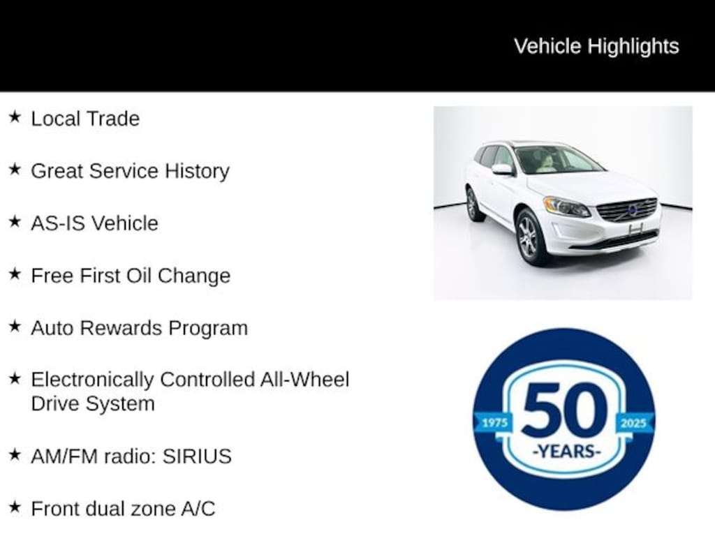 2014 Volvo XC60 T6 T6 3.0L V6 24V TurboCharged 6-Speed Automatic with Geartronic AWD 4D Sport Utility Crystal White Pearl Local Trade, Great Service History, AS-IS Vehicle, Free First Oil Change, Auto Rewards Program, AWD, Alloy wheels, AM/FM radio: SIRIUS, Electronically Controlled All-Wheel Drive System, Front dual zone A/C, Front fog lights, Fully automatic headlights, Heated door mirrors, Heated Front Seats, Illuminated entry, Leather Seating Surfaces, Leather Shift Knob, Memory seat, Power driver seat, Power moonroof, Power passenger seat, Rain sensing wipers, Rear fog lights, Remote keyless entry, Steering wheel mounted audio controls, Turn signal indicator mirrors.